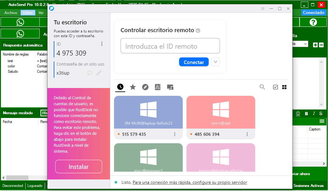 Resumen: Añadimos soporte remoto integrado en AutoSend. Agendas tu sesión, nos compartes tu ID y nos conectamos en minutos. Operamos con servidores propios para mayor velocidad, sin depender de colas en servicios de terceros.